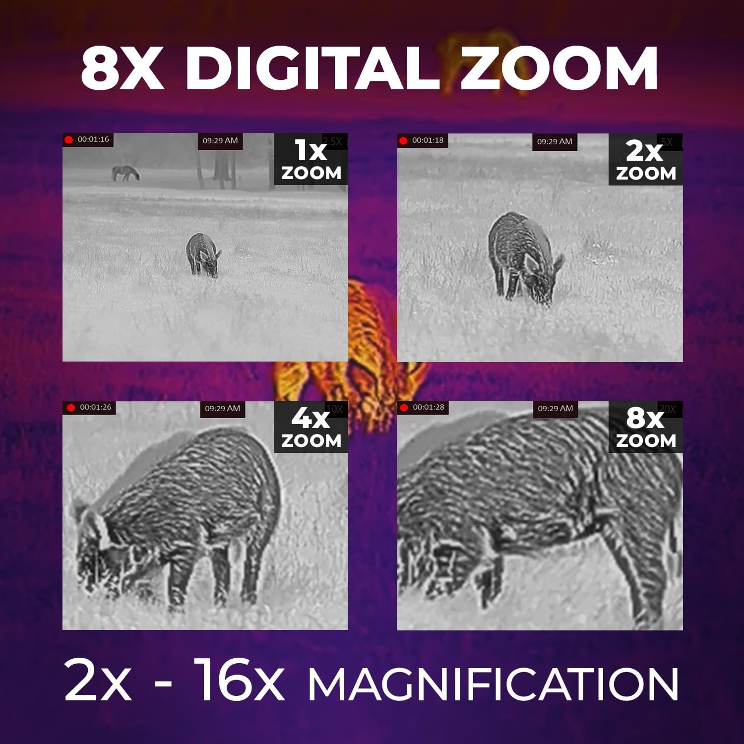 This thermal scope features a 35mm Germanium lens, a 640 × 512 resolution thermal sensor, and a 2x base magnification with a detection range of up to 1800 m/yd. Out of the two premium 640-resolution options, this thermal scope has a lower base magnification and a wider Field of View (12.5° × 10.0° or 65 ft @ 100 yds) providing extensive area coverage while scanning