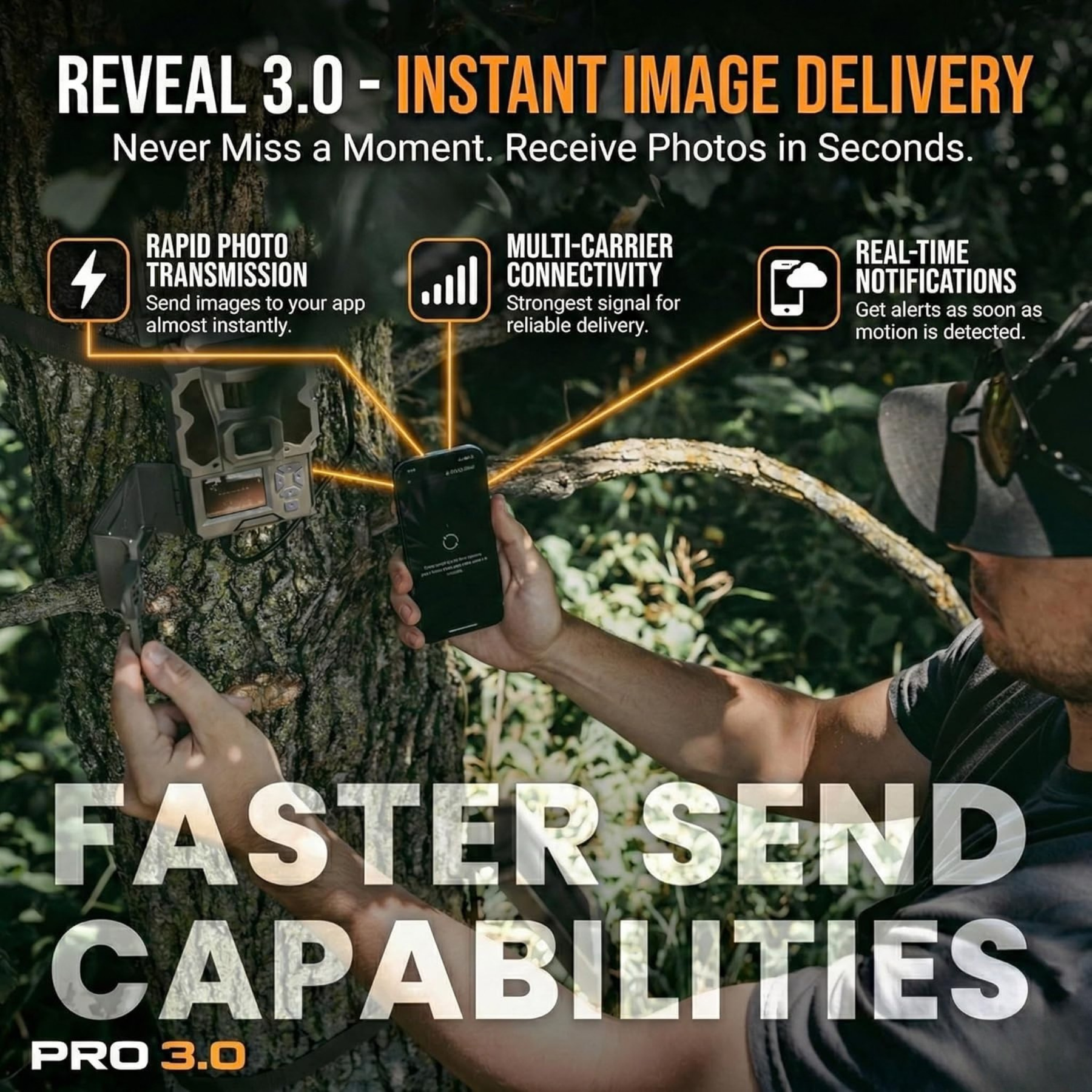 See what’s happening as it’s happening with the Tactacam REVEAL Pro 3.0 cellular trail camera. With undetectable No-Glow IR flash technology, exceptional battery life, and a user-friendly app, the Pro 3.0 will be your eyes from the field for the entirety of the season.The REVEAL Pro 3.0 has an optional SD card slot, an intuitive 2”LCD screen, HD photos and on-demand videos that can be requested straight from the app, along with GPS to ensure your camera is always on the map. The REVEAL Pro 3.0 is a multi-carrier capable camera that works on multiple cellular networks.
